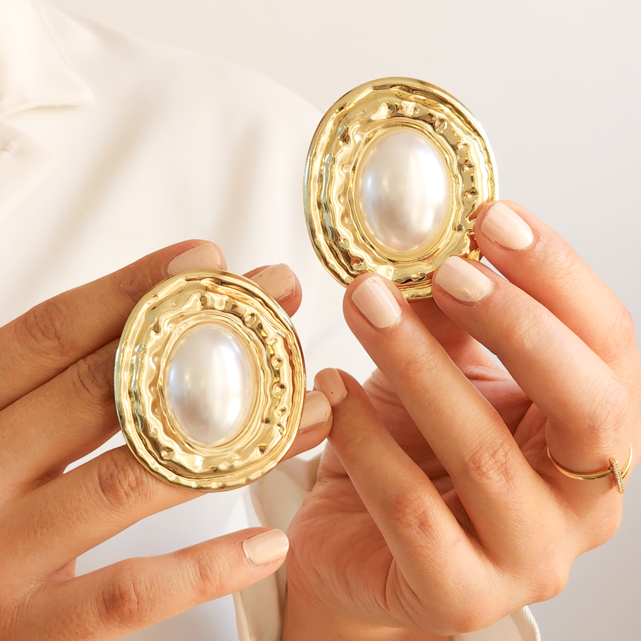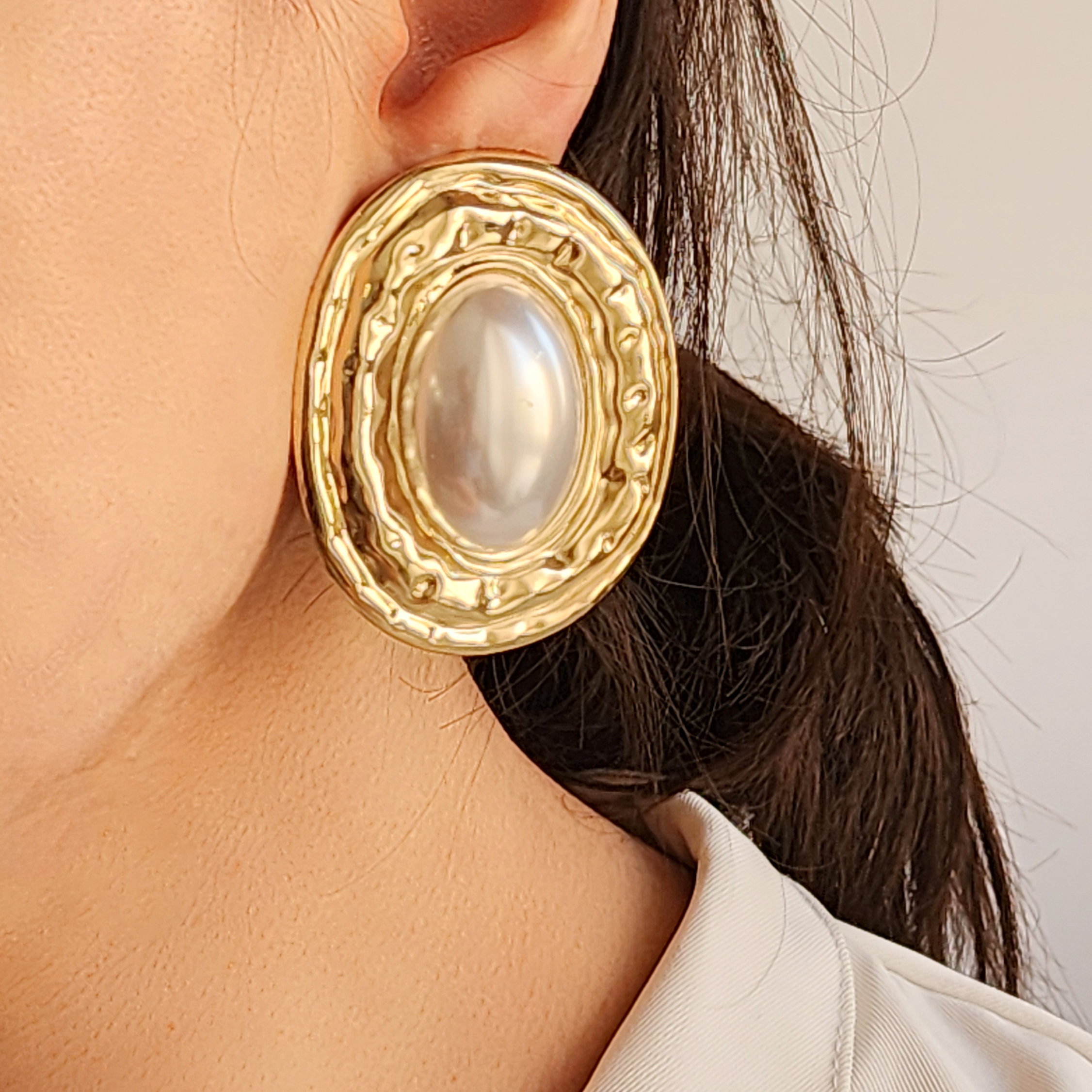 گوشواره مروارید مصنوعی بزرگ‌نمایی شده زنانه – با ظاهری لوکس و خاص، طرح بیضی شکل، مناسب ست کردن در مهمانی‌ها.